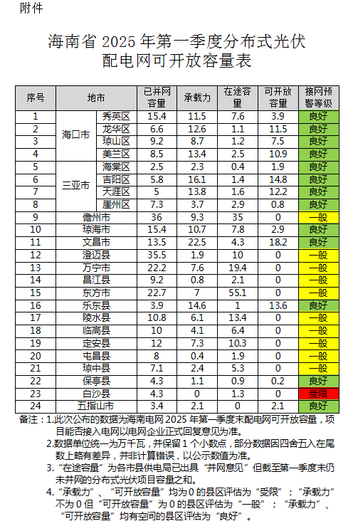 为引领我省分布式光伏发电科学合理布局,省发展改革委联合海南电网公司开展了全省分布式光伏接入电网承载能力测算和可开放容量评估工作,现将海南省2025年第一季度分布式光伏配电网可开放容量予以公布。